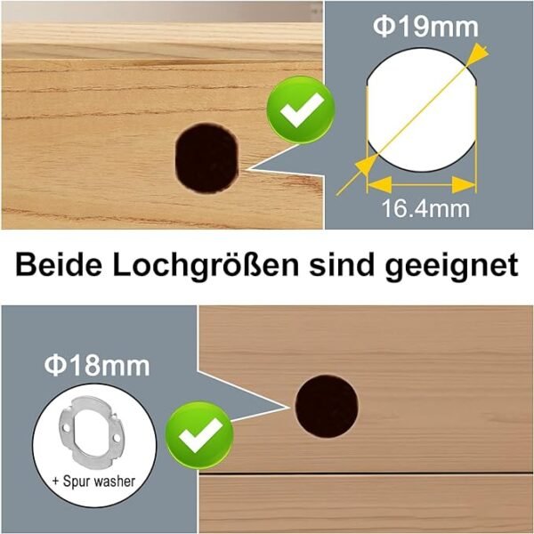 - Einfacher Einbau: Das Schloss hat eine Einbautiefe von 20 mm und ist einfach zu installieren. Es kann an den meisten Standard-Schränken und Schubladen angebracht werden, ohne dass umfangreiche Modifikationen erforderlich sind.