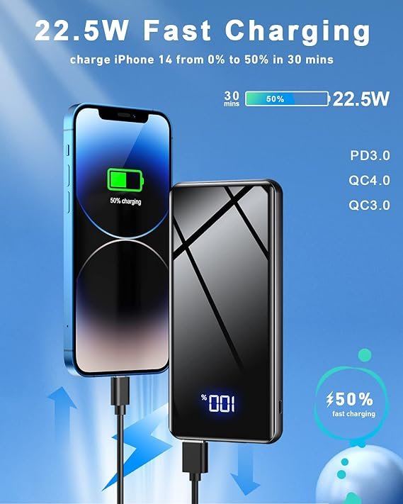 2. Leistung: Die Power Bank unterstützt schnelles Laden mit einer Leistung von bis zu 22,5W. Dies ermöglicht eine schnelle Aufladung Ihrer Geräte, was besonders praktisch für unterwegs ist.